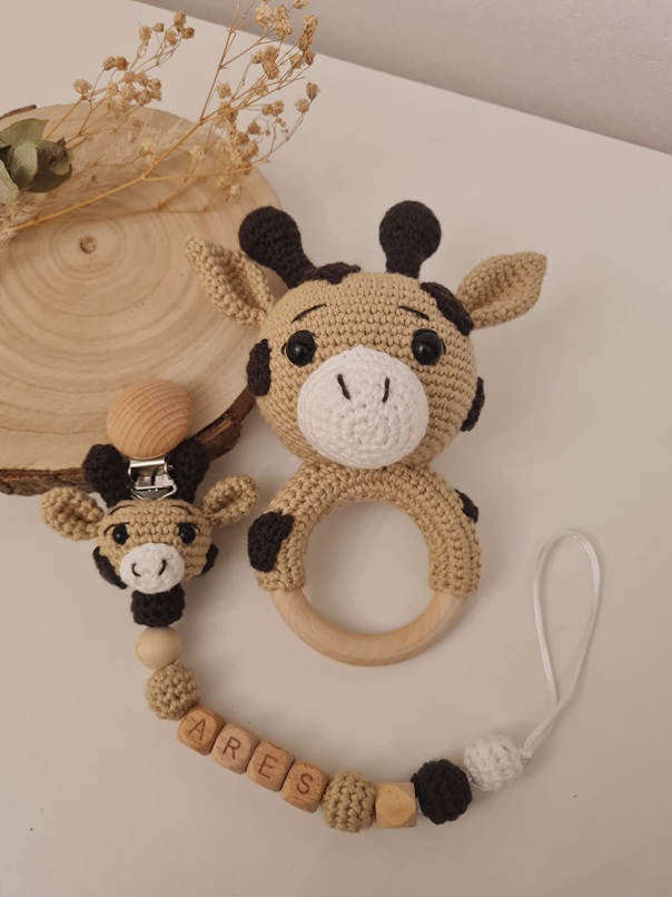 Chupetero personalizado y sonajero haciendo juego. Hecho a mano con hilo 100% algodón.